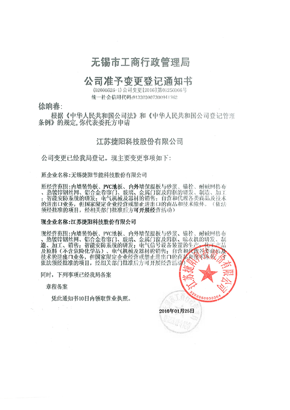 由于公司發展需要,“無錫捷陽節能科技股份有限公司”名稱從 2016 年1 月25 日變更登記為“江蘇捷陽科技股份 有限公司”,屆時原公司“無錫捷陽節能科技股份有限公司”的全部業務由江蘇捷陽科技股份有限公司繼續經營,原公司 的所有債權債務由江蘇捷陽科技股份有限公司承繼,原公司簽訂的合同繼續有效。 即日起,公司所有對內及對外文件、資料、開據發票,賬號,稅號等全部使用新公司名稱。